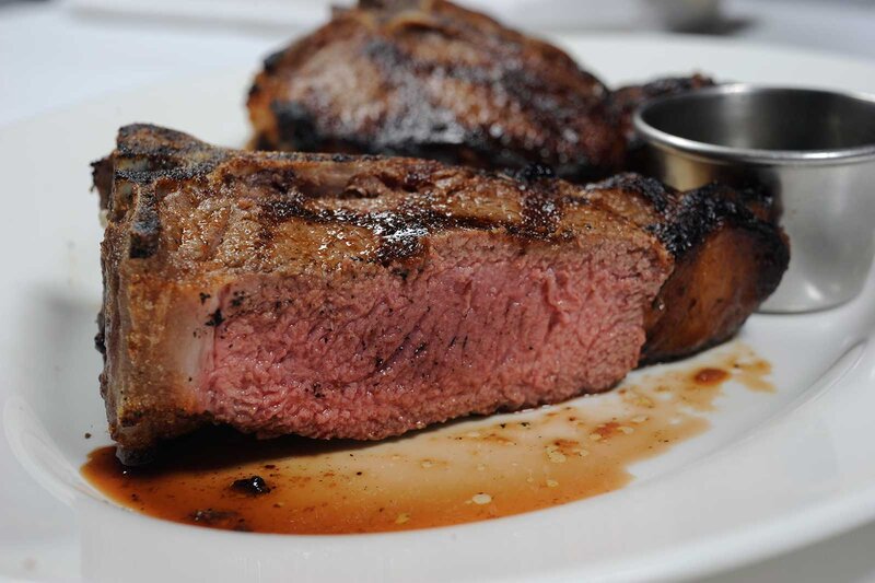 Close up of plated steak with Dino and Harry's logo in the background